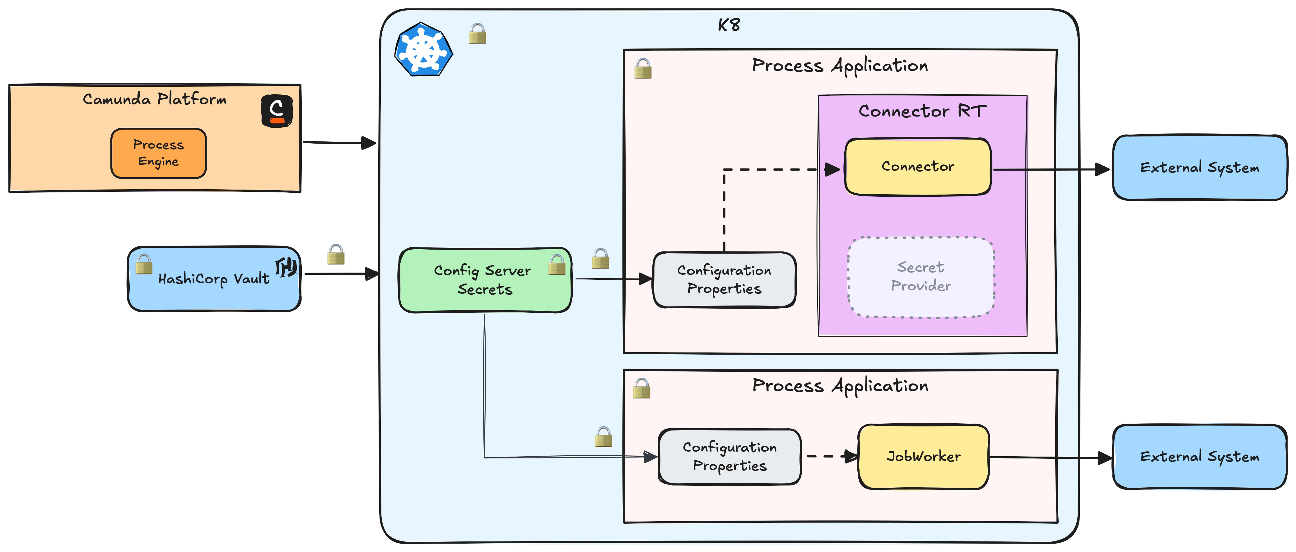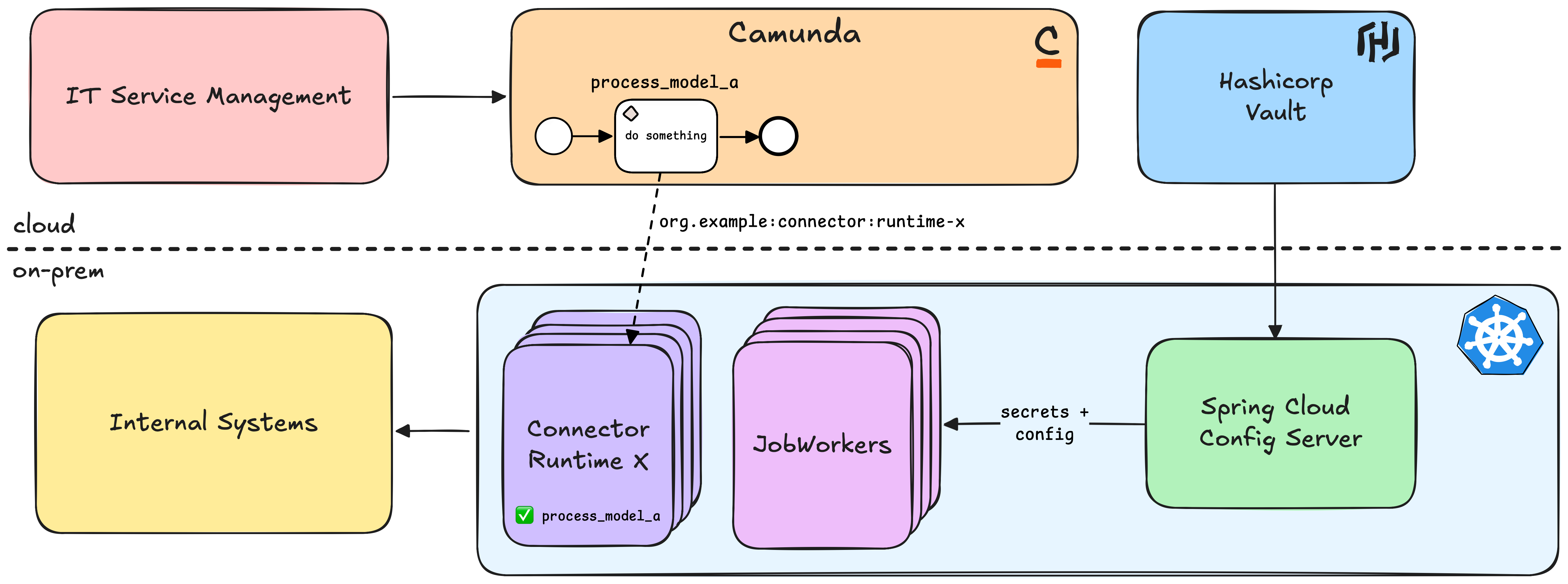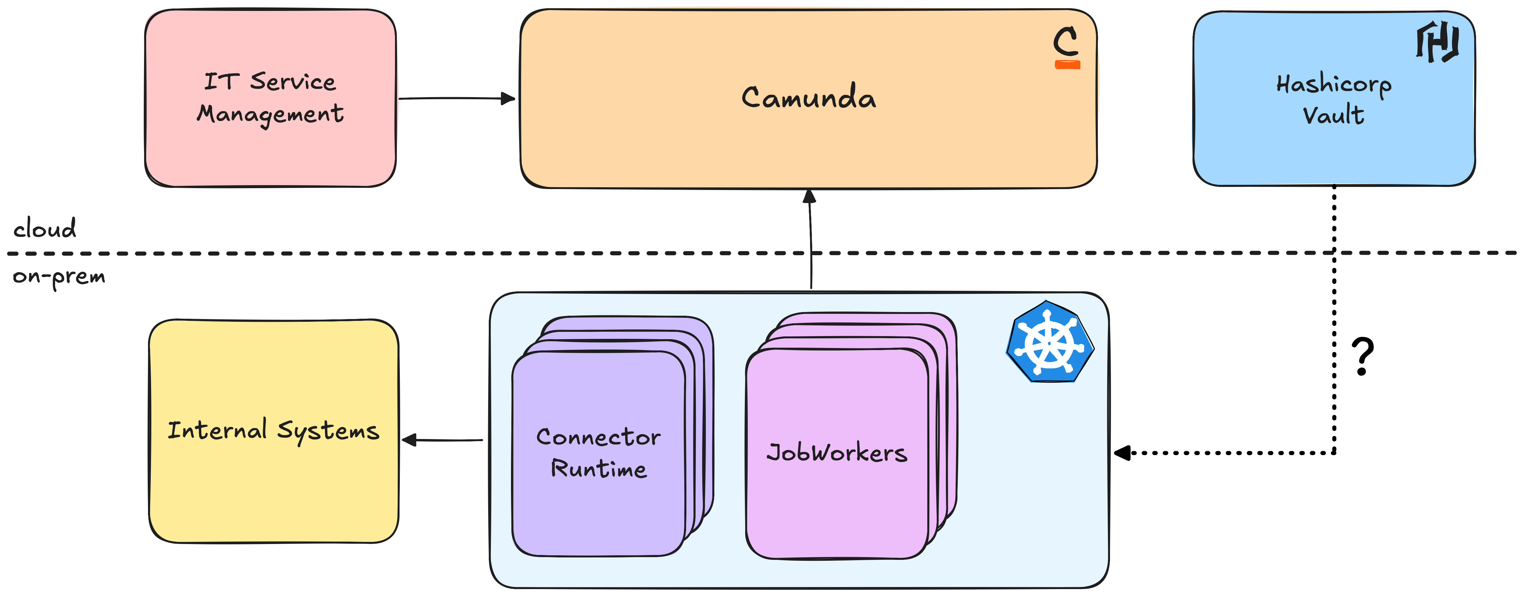 I was tasked with helping to develop a scalable target architecture for the new process platform. This architecture should support multiple JobWorkers and Connectors to integrate systems, as well as a third-party secret provider called HashiCorp Vault. We need to support multiple business units as well, which will all have their own connectors, secrets and processes.