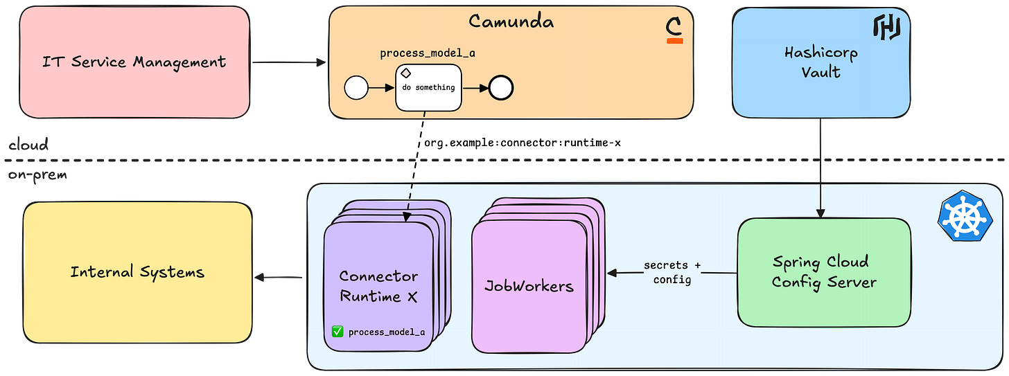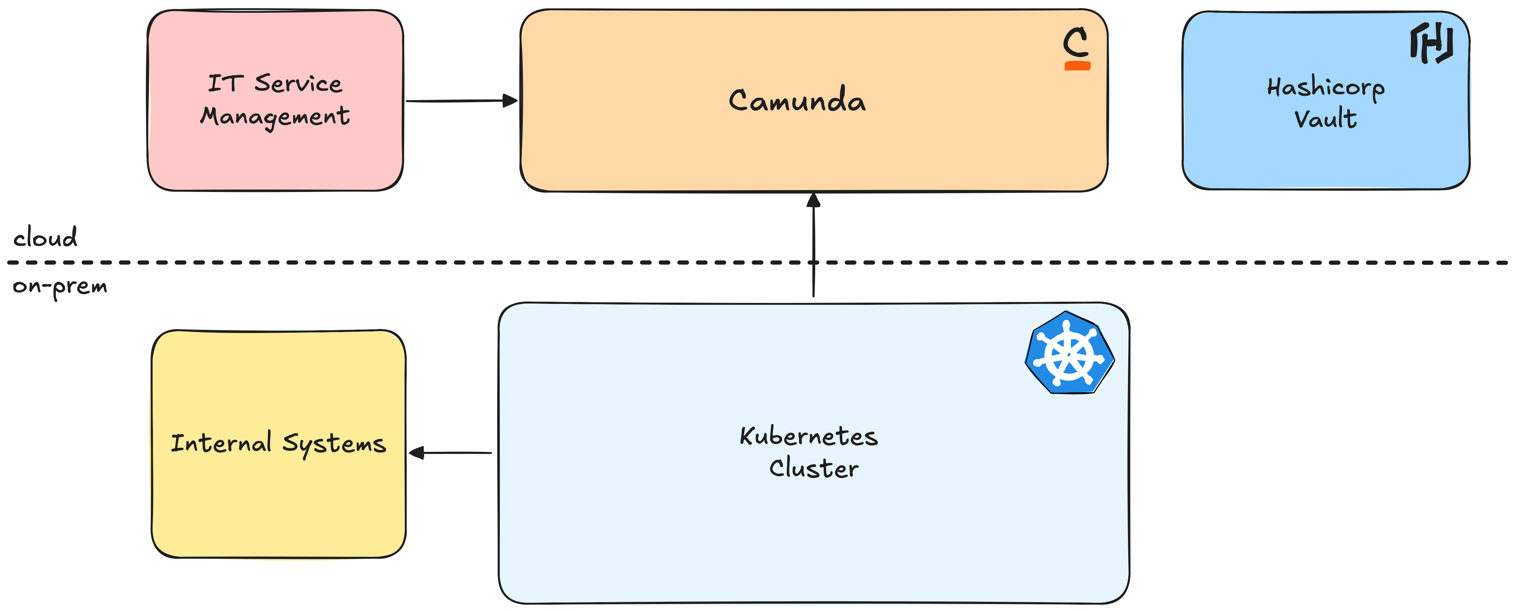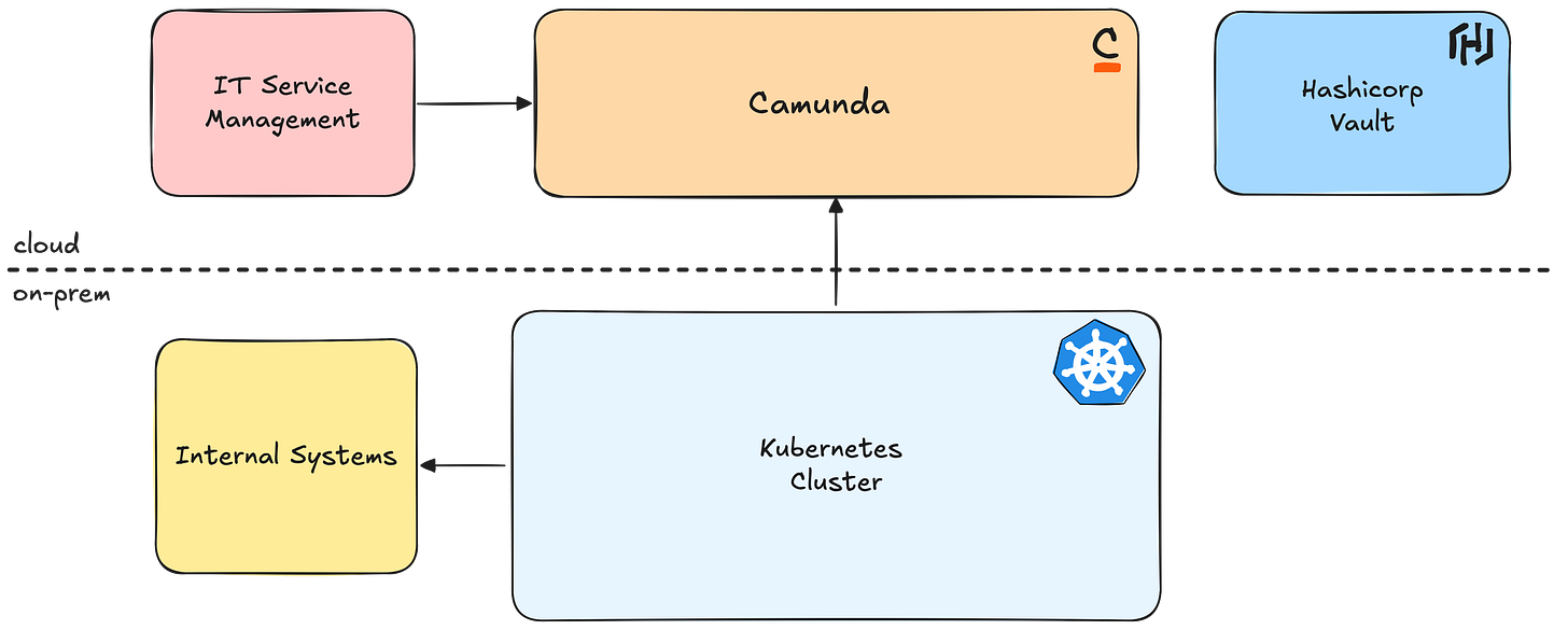 The initial landscape already has some great cornerstones in place. We’re using Kubernetes as the runtime for applications, Camunda to orchestrate processes, and Vault to manage the credentials of the target systems.