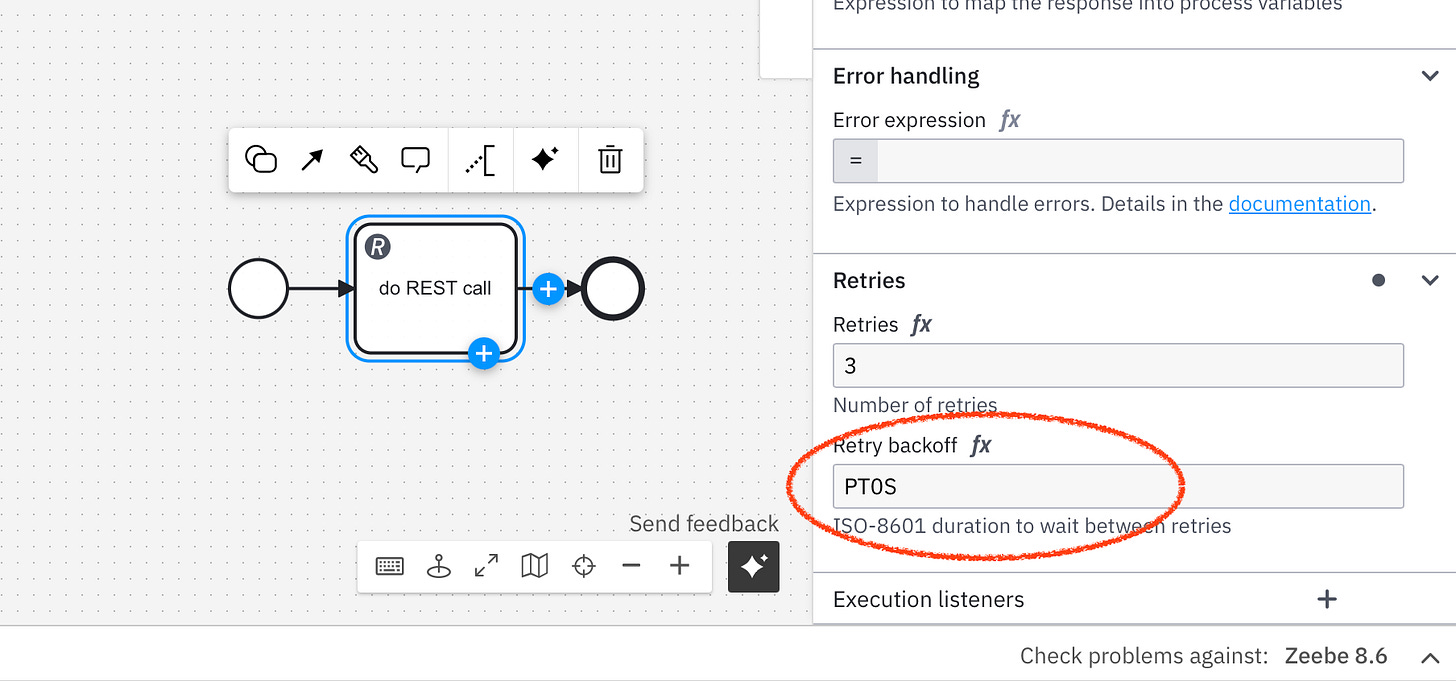 If credentials are invalid, it will repeat the call until it either works, or the amount of retries is exhausted. By default, Camunda doesn’t wait between retries, giving us a relatively small timeframe to fix the issue. For that we can use a mechanism called retry backoff.