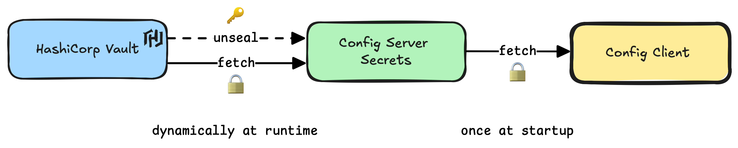 The communication between config server and client is also restricted. We’ll hand in those secrets in a separate phase, before we connect to the server to get the runtime secrets.