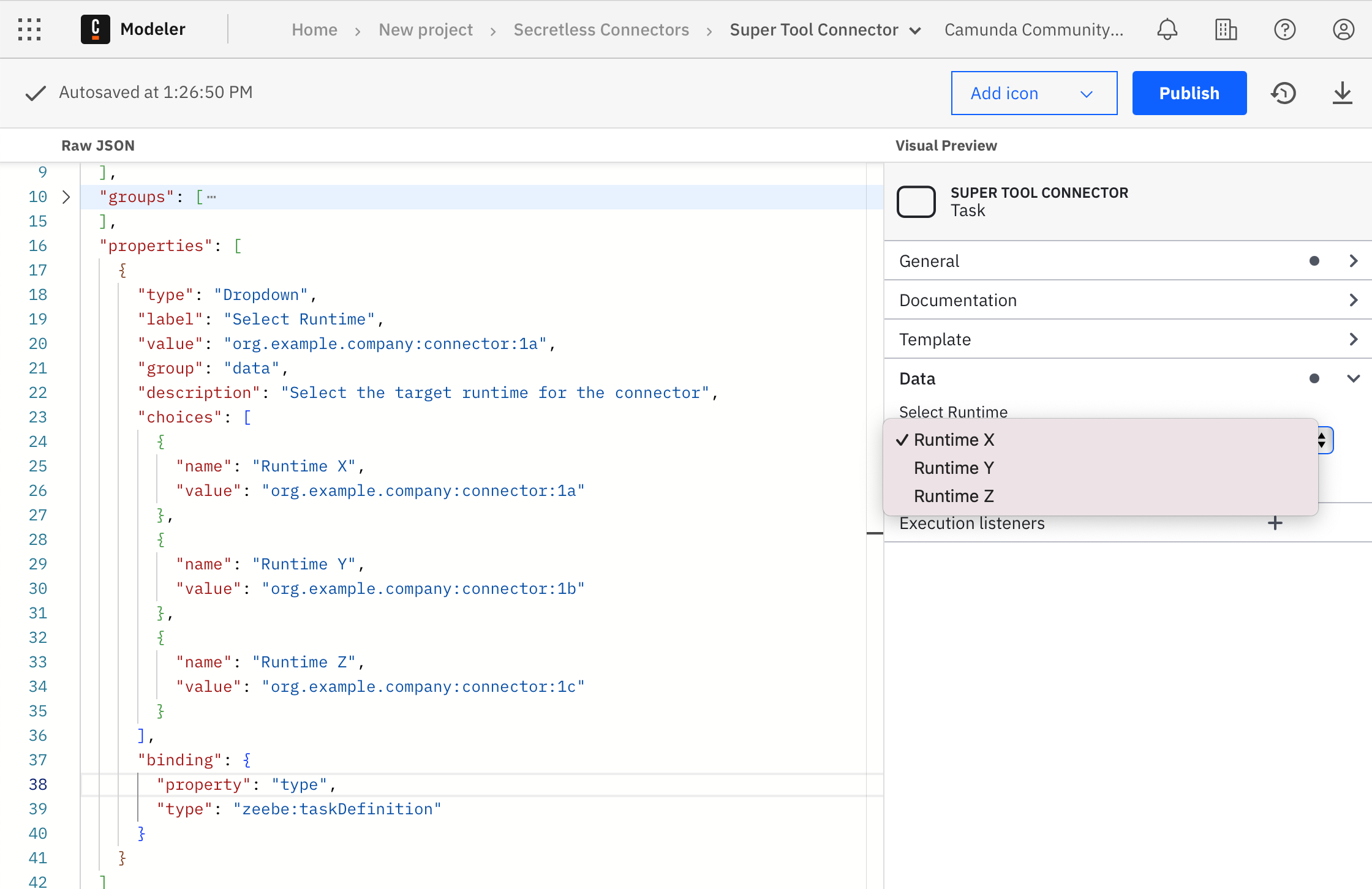 In the template, this value is normally hidden for users, but one can also just set it as a dynamic value by making the field visible in the modeler. Since we want to make sure that the correct value is set, we decided to offer a simple drop-down menu in our templates, with all existing runtimes.