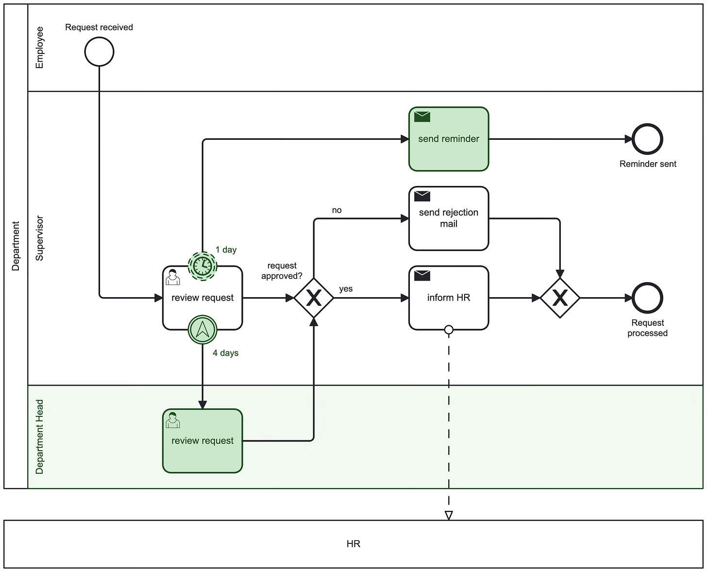Now, there are two new elements attached to the manual task, indicating some time restrictions. They lead to follow-up tasks for the supervisor and the department head. Let’s look at them one by one.