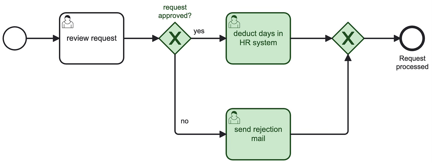 The process also supports an update of an external system. Even though it is a manual task, the model makes this step visible for the reader: “In case of approval, the HR system has to be updated with the vacation days left for the employee.”